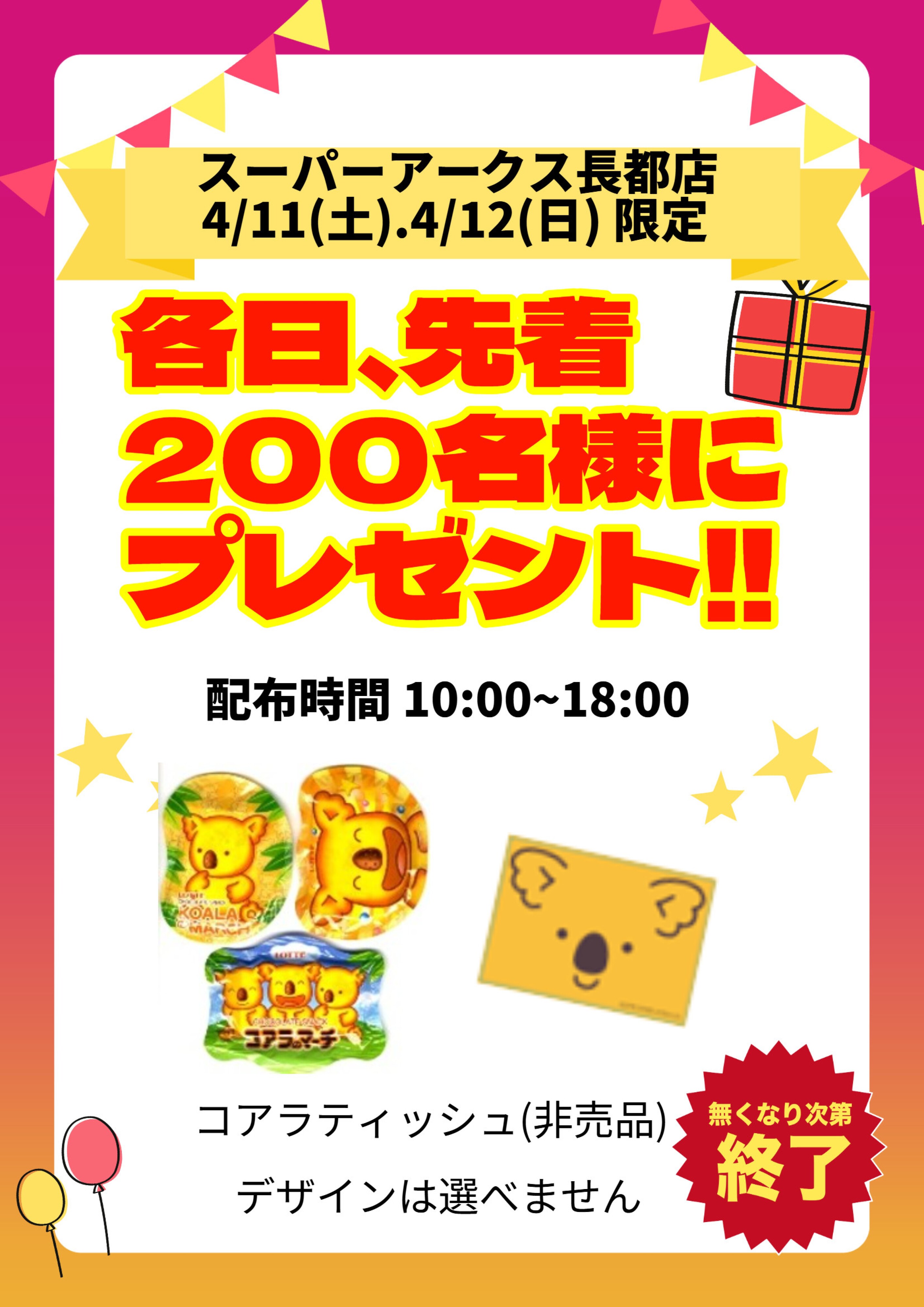 4月11・12日(土・日)10:00~18:001階センター広場スーパーアークス長都店にてロッテ商品300円以上のレシートで抽選会に参加できます!各日、先着200名様にコアラティッシュプレゼント‼詳しくはコチラ※関係者の諸事情で、変更・中止になる場合がございます。 あらかじめご了承ください。